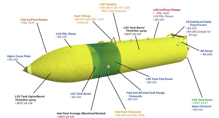 Figure 3.2-4. Locations of the various foam systems as used on ET-93, the External Tank used for STS-107.