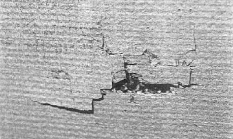 RCC components have been struck by objects throughout their operational life, but none of these components has been completely penetrated. A sampling of 21 post-flight reports noted 43 hypervelocity impacts, the largest being 0.2 inch. The most significant low-velocity impact was to Atlantis panel 10-right during STS-45 in March andApril 1992. The damaged area was 1.9 inches by 1.6 inches on the exterior surface and 0.5 inches by 0.1 inches in the interior surface. The substrate was exposed and oxidized, and the panel was scrapped. Analysis concluded that the damage was caused by a strike by a man-made object, possibly during ascent. Figures 3.3-2 and 3.3-3 show the damage to the outer and inner surfaces, respectively.