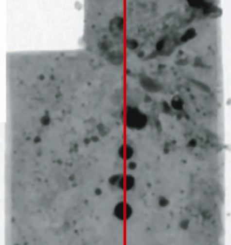 図3-7-7: X線分析による8番RCCパネルの左側の画像。スラグの付着物が底面から上に向かって並んでいる。